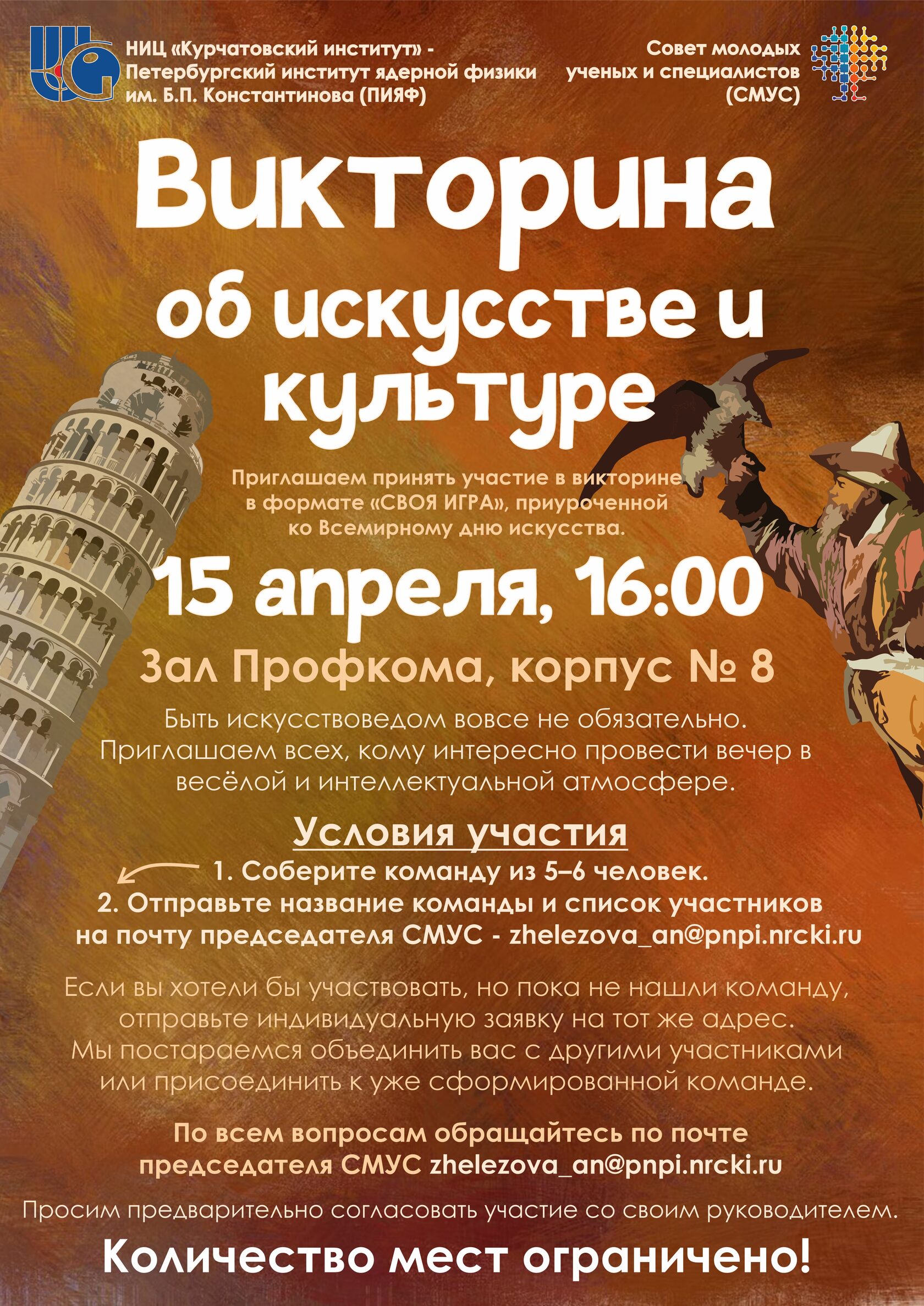 Совет молодых учёных и специалистов приглашает всех работников Института принять участие в викторине в формате «СВОЯ ИГРА», приуроченной ко Всемирному дню искусства.